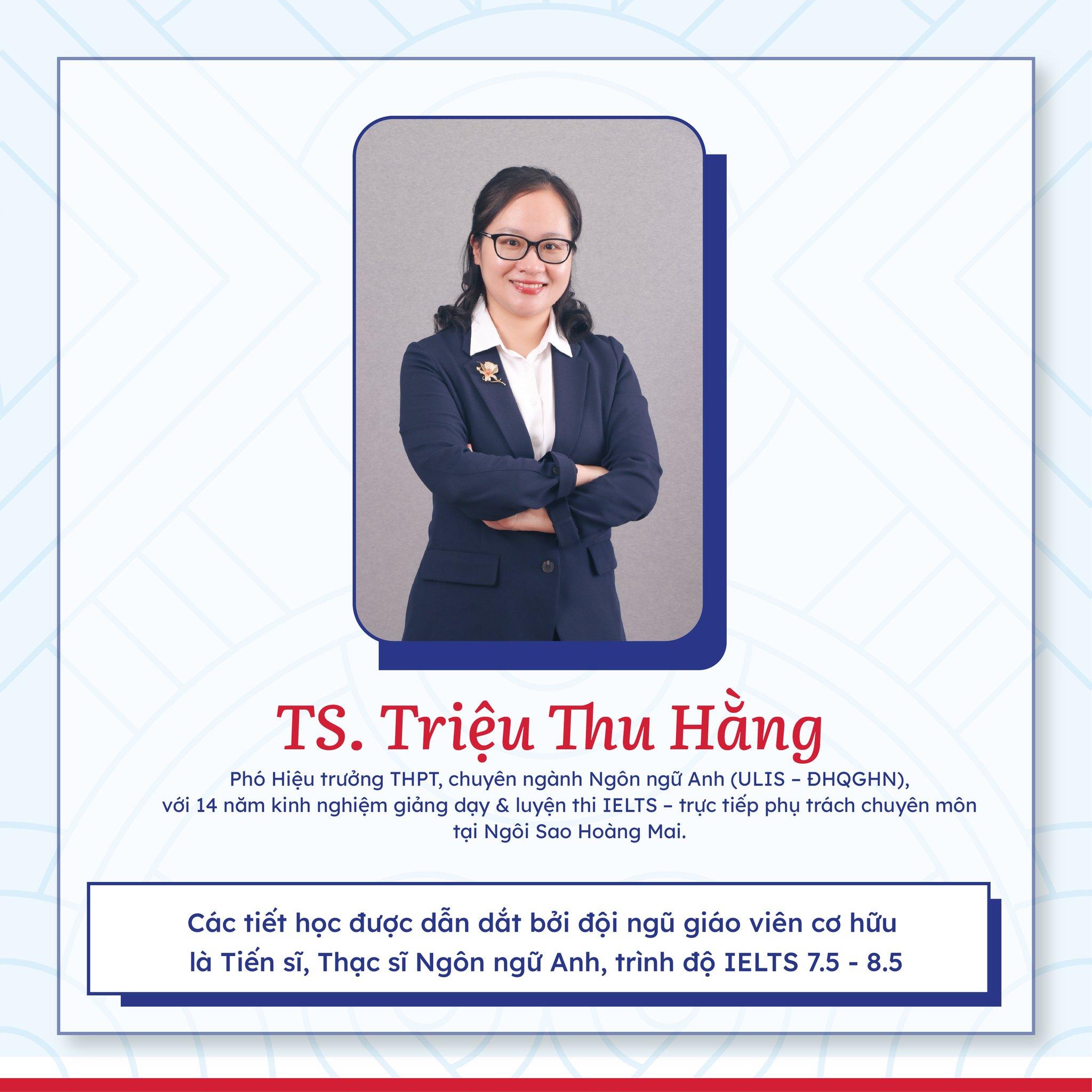 🌈Hơn hết, đội ngũ giáo viên cơ hữu chính là yếu tố quyết định để hiện thực hóa mục tiêu của chương trình IELTS tại Ngôi Sao Hoàng Mai. Các thầy cô là những Tiến sĩ, Thạc sỹ về Ngôn ngữ Anh với trình độ IELTS 7.5 - 8.5. Đặc biệt, Cô Triệu Thu Hằng - Tiến sĩ chuyên ngành Ngôn ngữ Anh, Đại học Ngoại ngữ - ĐHQGHN với 14 năm kinh nghiệm giảng dạy và luyện thi IELTS, trực tiếp phụ trách dẫn dắt bộ môn này tại Ngôi Sao Hoàng Mai.
