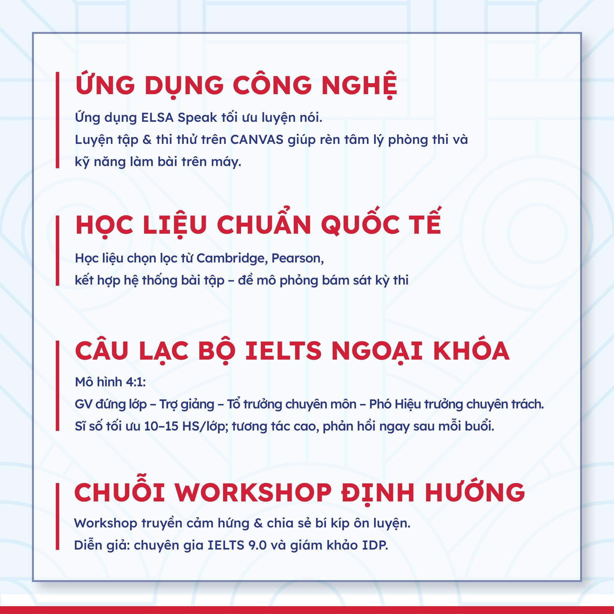 🎯Đặc biệt, Câu lạc bộ IELTS ngoại khóa tại trường áp dụng mô hình 4:1 với sĩ số nhỏ 10–15 học sinh/lớp: 01 giáo viên đứng lớp – 01 trợ giảng – 01 tổ trưởng chuyên môn – 01 Phó Hiệu trưởng chuyên trách. Đi kèm là chuỗi Workshop IELTS chuyên sâu do chuyên gia IELTS 9.0 và giám khảo IDP trực tiếp dẫn dắt, giúp học sinh thành thạo kỹ năng phân tích đề, tư duy học thuật và chiến lược làm bài chuẩn quốc tế