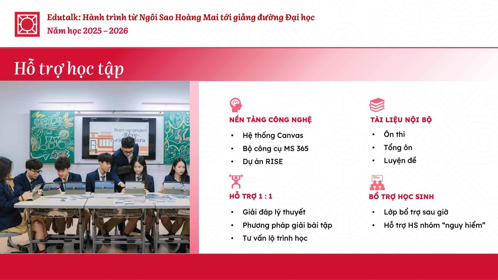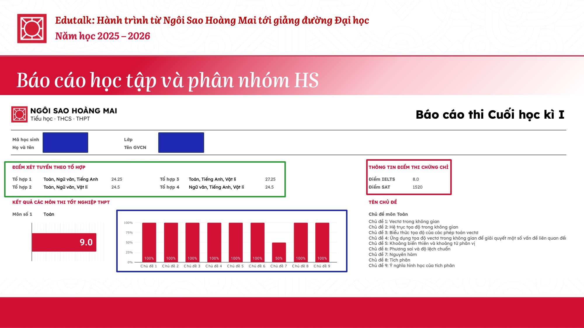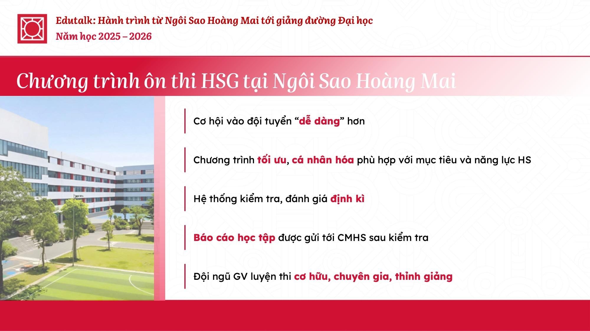 🌈 Tối 17/12/2025, Trường Ngôi Sao Hoàng Mai tiếp tục chuỗi EDUTALK 2025: “Từ Ngôi Sao Hoàng Mai tới Giảng đường Đại học” với Buổi 3 – Giới thiệu Chương trình Ôn thi & Dự án 12. Buổi chia sẻ giúp Cha mẹ hiểu rõ chiến lược ôn thi THPT Quốc gia, bồi dưỡng HSG và tư vấn học thuật theo từng giai đoạn – những yếu tố then chốt ở chặng nước rút THPT.