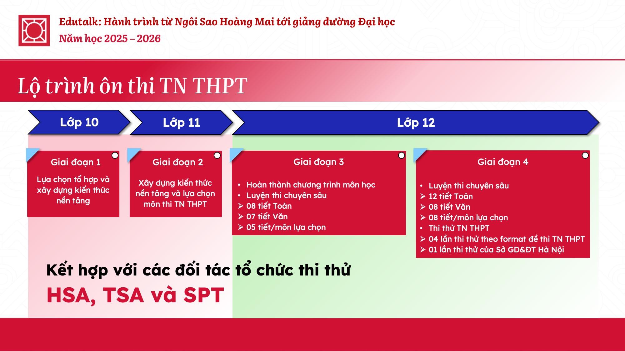 📊 Chương trình ôn thi Tốt nghiệp THPT được xây dựng bài bản từ lớp 10–12, đáp ứng các kỳ thi THPT, HSA, TSA, SPT, với lộ trình: