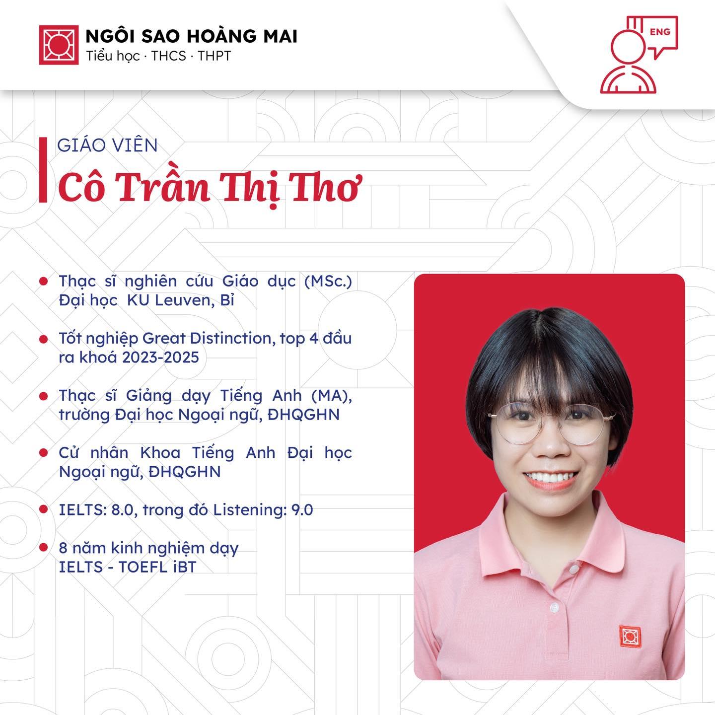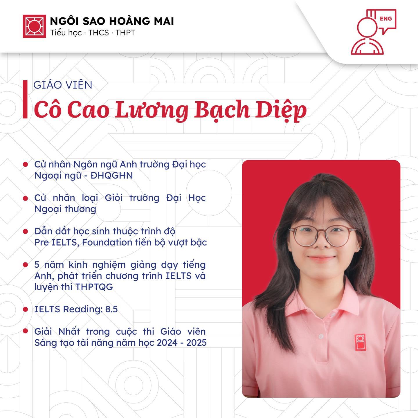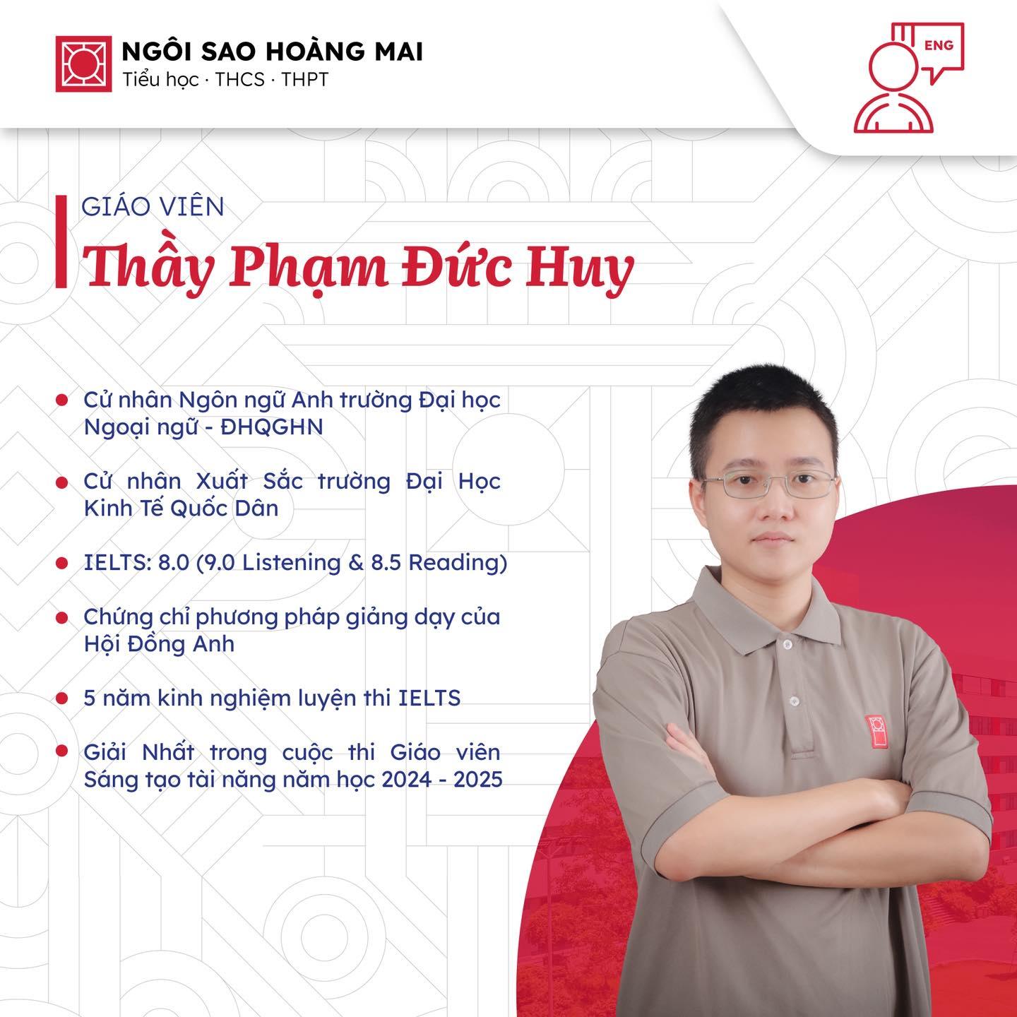 🌎Trong kỷ nguyên toàn cầu hóa, nơi tri thức vượt qua mọi biên giới và tiếng Anh trở thành “ngôn ngữ của tương lai”, việc sở hữu chứng chỉ IELTS không chỉ là một mục tiêu học tập, mà là tấm hộ chiếu mở ra cánh cửa du học, học bổng và cơ hội nghề nghiệp toàn cầu. Hiểu sâu sắc điều đó, Ngôi Sao Hoàng Mai đã kiến tạo một hệ sinh thái IELTS hiện đại – chuẩn quốc tế – cá nhân hóa, nơi mỗi học sinh được dẫn dắt bằng một triết lý duy nhất: thành công không đến từ luyện thi, mà đến từ tư duy học thuật vững vàng.