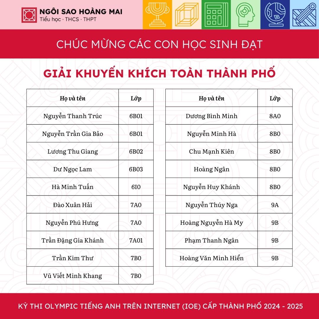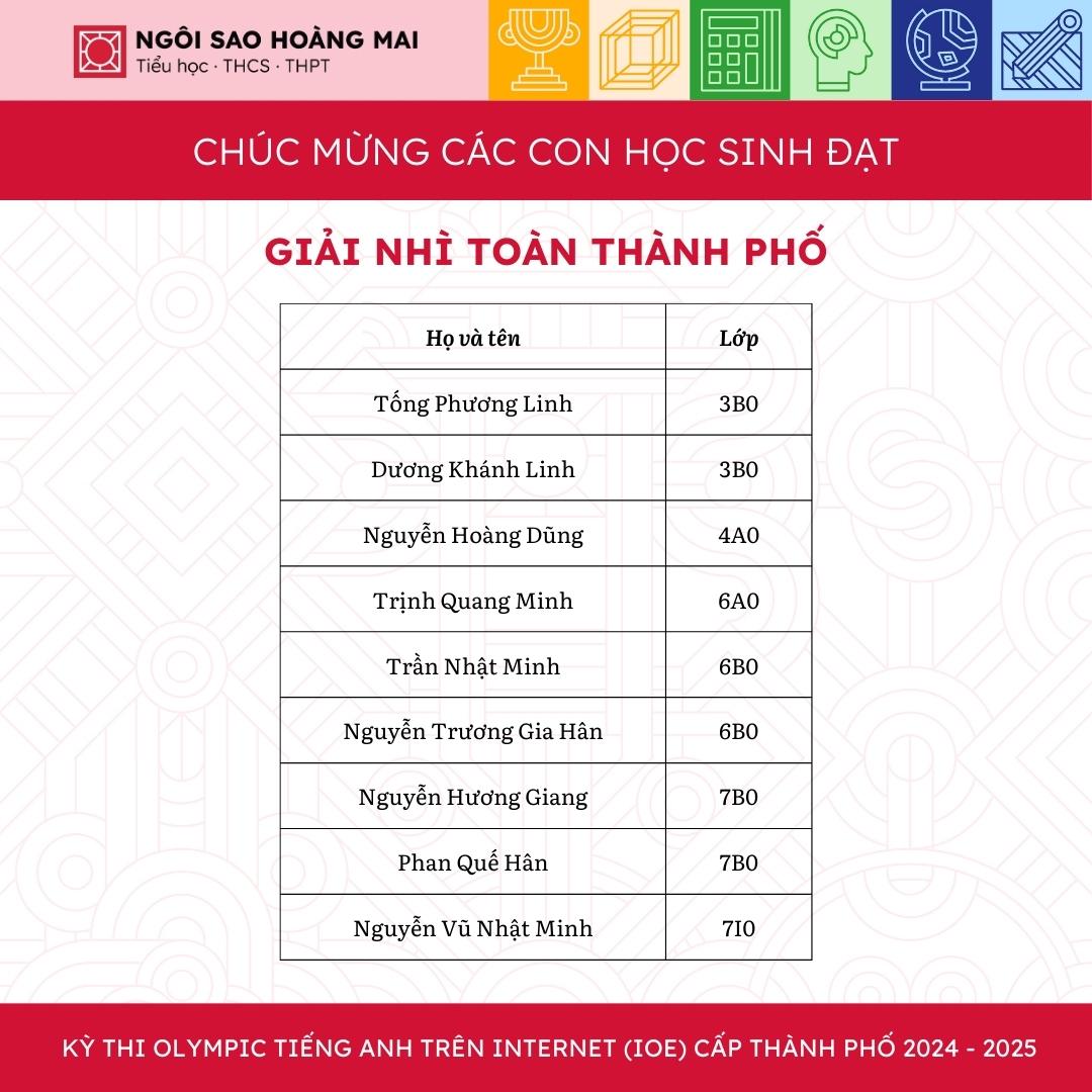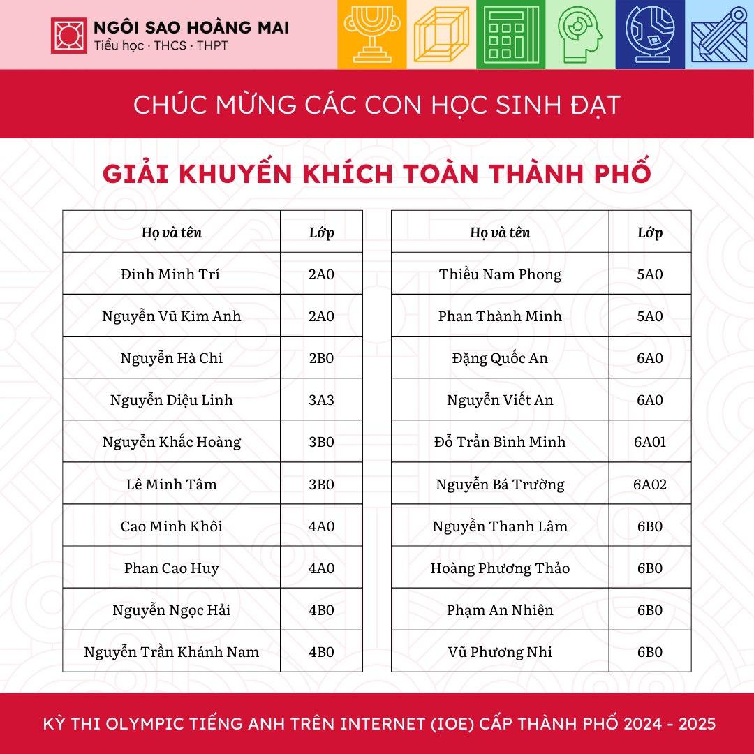 Một lần nữa, Ngôi Sao Hoàng Mai xin được chúc mừng tất cả học sinh, thầy cô và gia đình. Hy vọng rằng, các con sẽ tiếp tục phát huy tài năng và tiến xa hơn ở những cuộc thi trí tuệ trong tương lai.