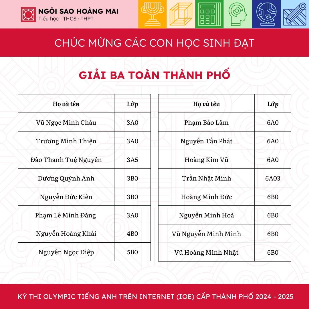 Trên hành trình chinh phục đấu trường Olympic Tiếng Anh trên Internet (IOE) đầy cam go, các con học sinh cấp Tiểu học và THCS trường Ngôi Sao Hoàng Mai tiếp tục ghi dấu ấn rực rỡ với 96 giải thưởng tại vòng cấp Thành phố. Trong đó: