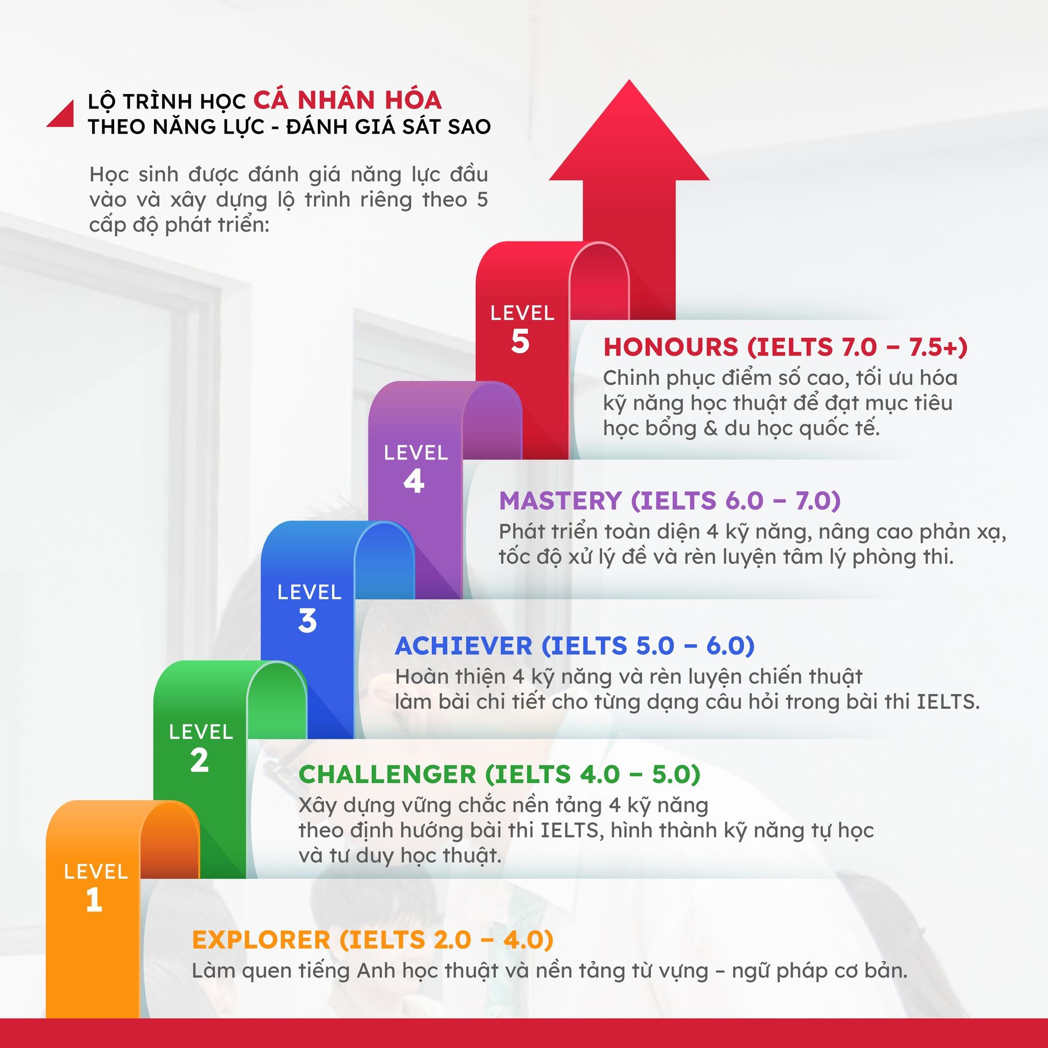 📋Học sinh được đánh giá năng lực đầu vào và xây dựng lộ trình riêng theo 5 cấp độ phát triển: