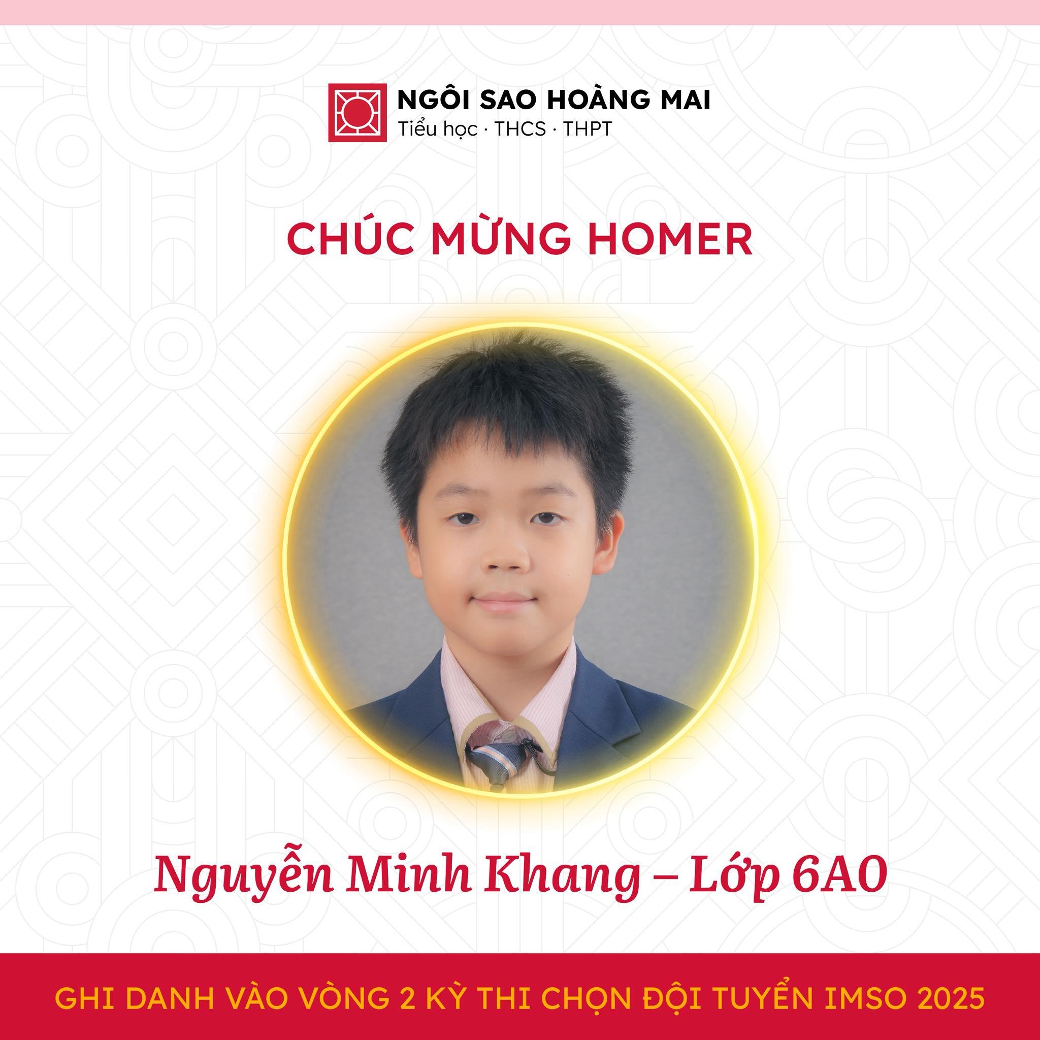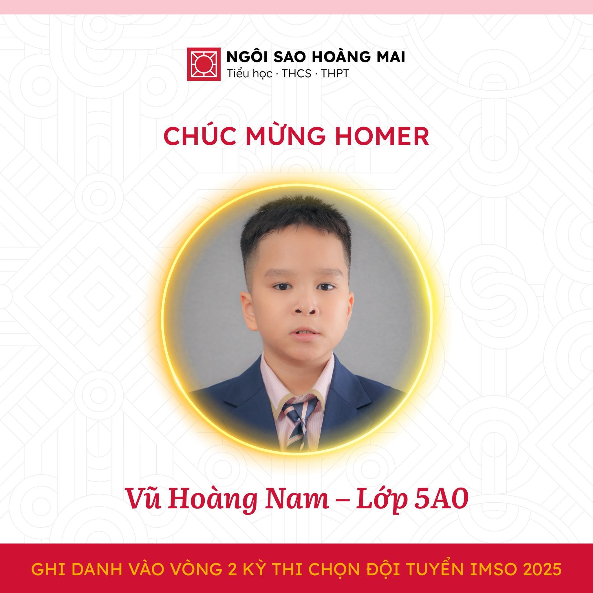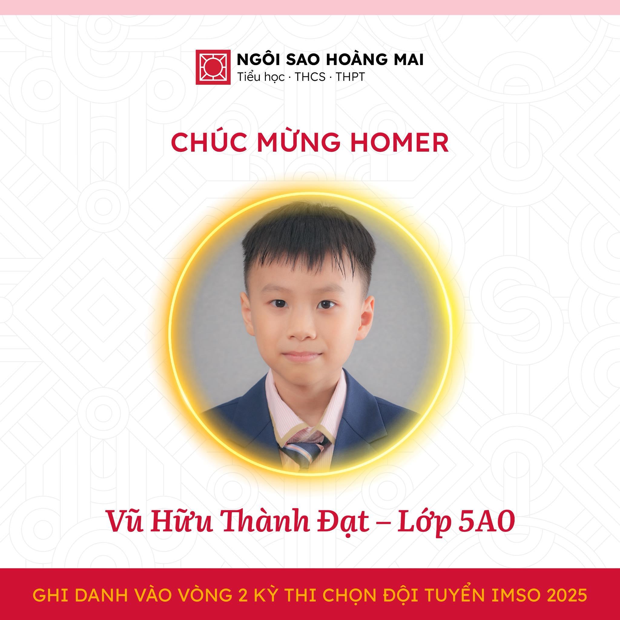 🎉 Trải qua hành trình ôn luyện nghiêm túc với các vòng thi đầy thử thách, 04 Homer Ngôi Sao Hoàng Mai đã xuất sắc vượt qua hàng ngàn thí sinh tài năng, chính thức ghi tên mình vào vòng 2 kỳ thi chọn đội tuyển IMSO 2025. Xin chúc mừng những gương mặt tiêu biểu: