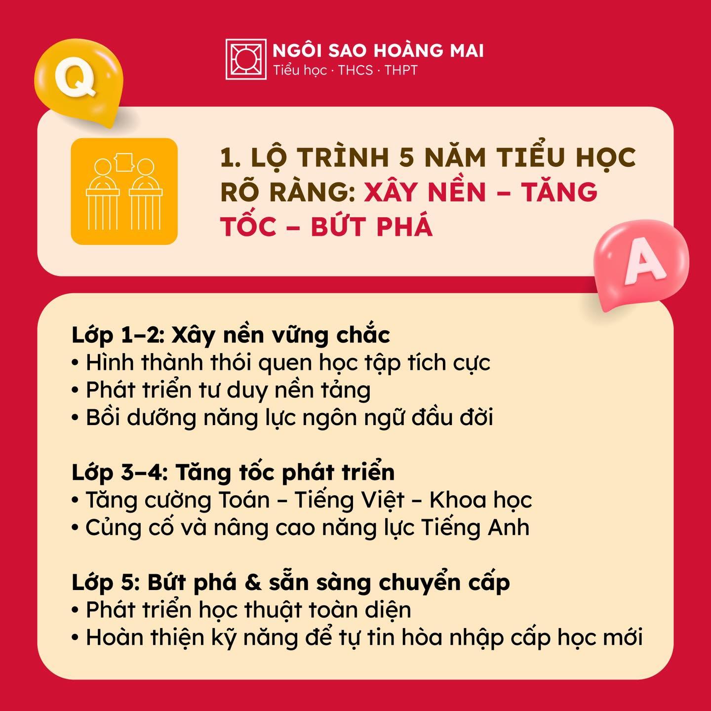 🌱 Chương trình Tiểu học tại Ngôi Sao Hoàng Mai được thiết kế theo định hướng xây nền – tăng tốc – bứt phá, giúp trẻ phát triển đều ở 3 trụ cột: tư duy – ngôn ngữ – kỹ năng, đồng thời tạo ra sự khác biệt rõ rệt ngay trong 1 năm đầu tiên đến trường.