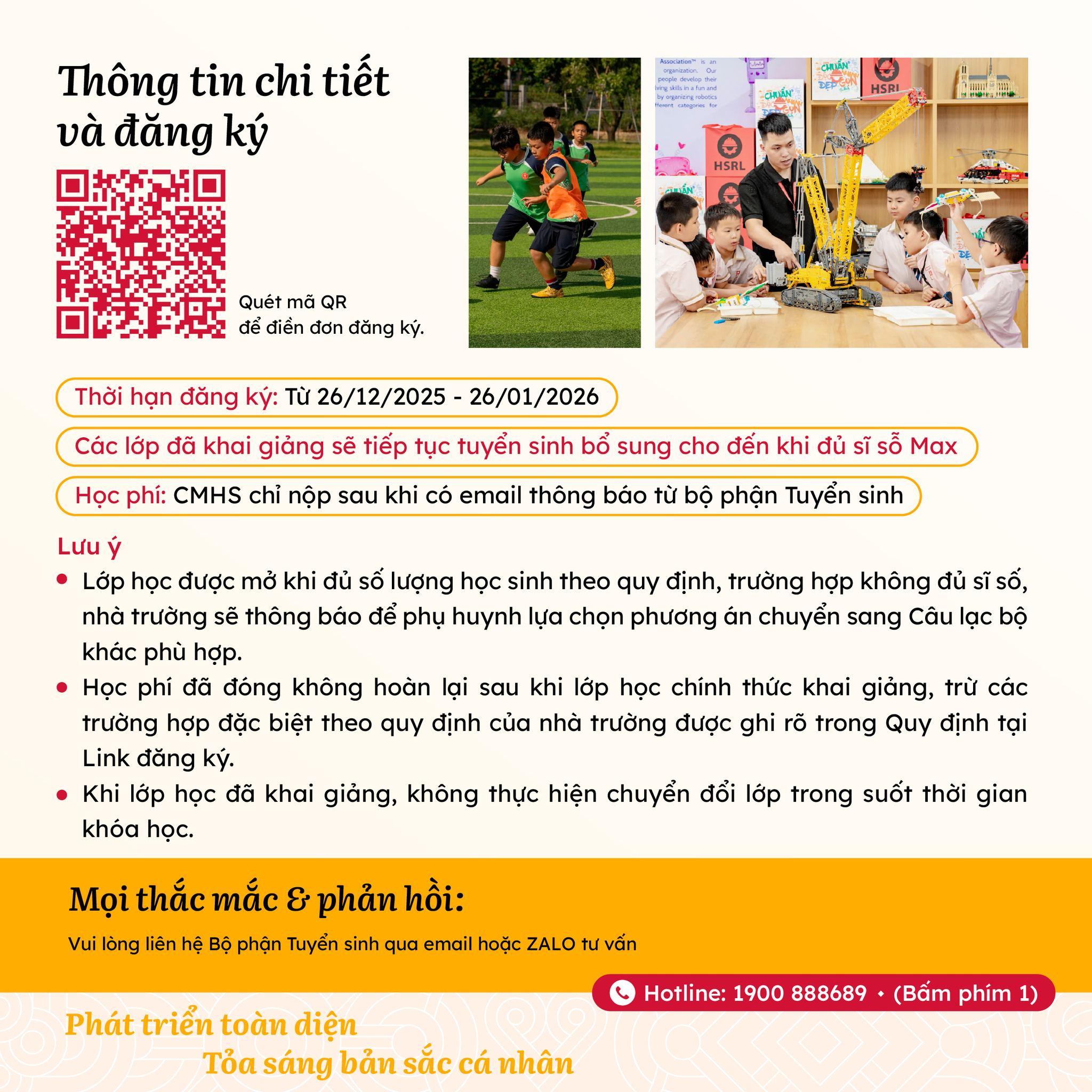💌 Quý Cha Mẹ hãy nhanh tay đăng ký để con tham gia CLB yêu thích và bắt đầu hành trình phát triển toàn diện đầy hứng khởi ngay hôm nay!