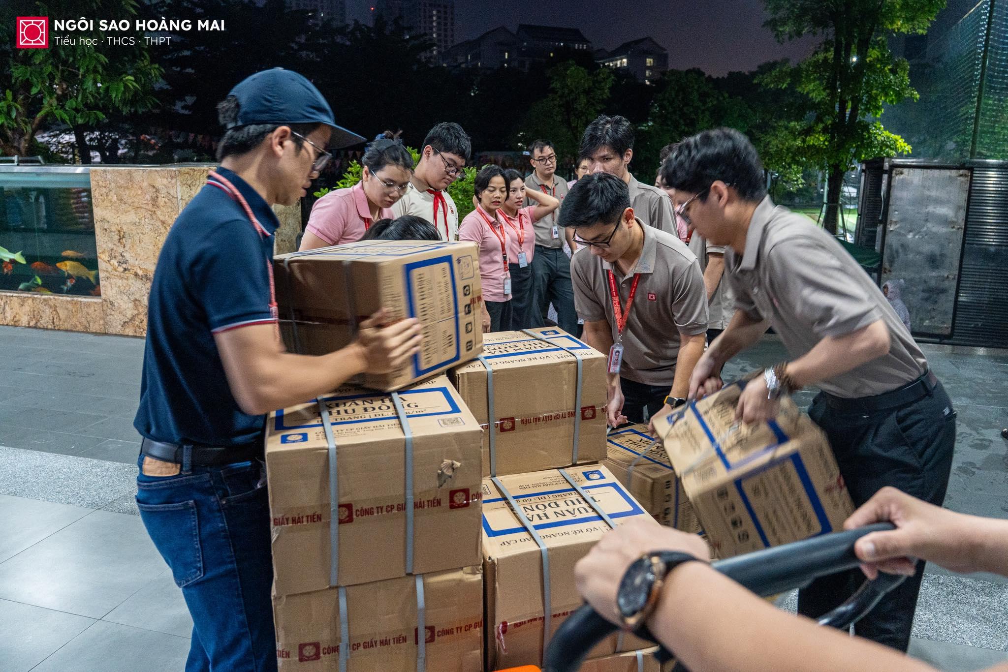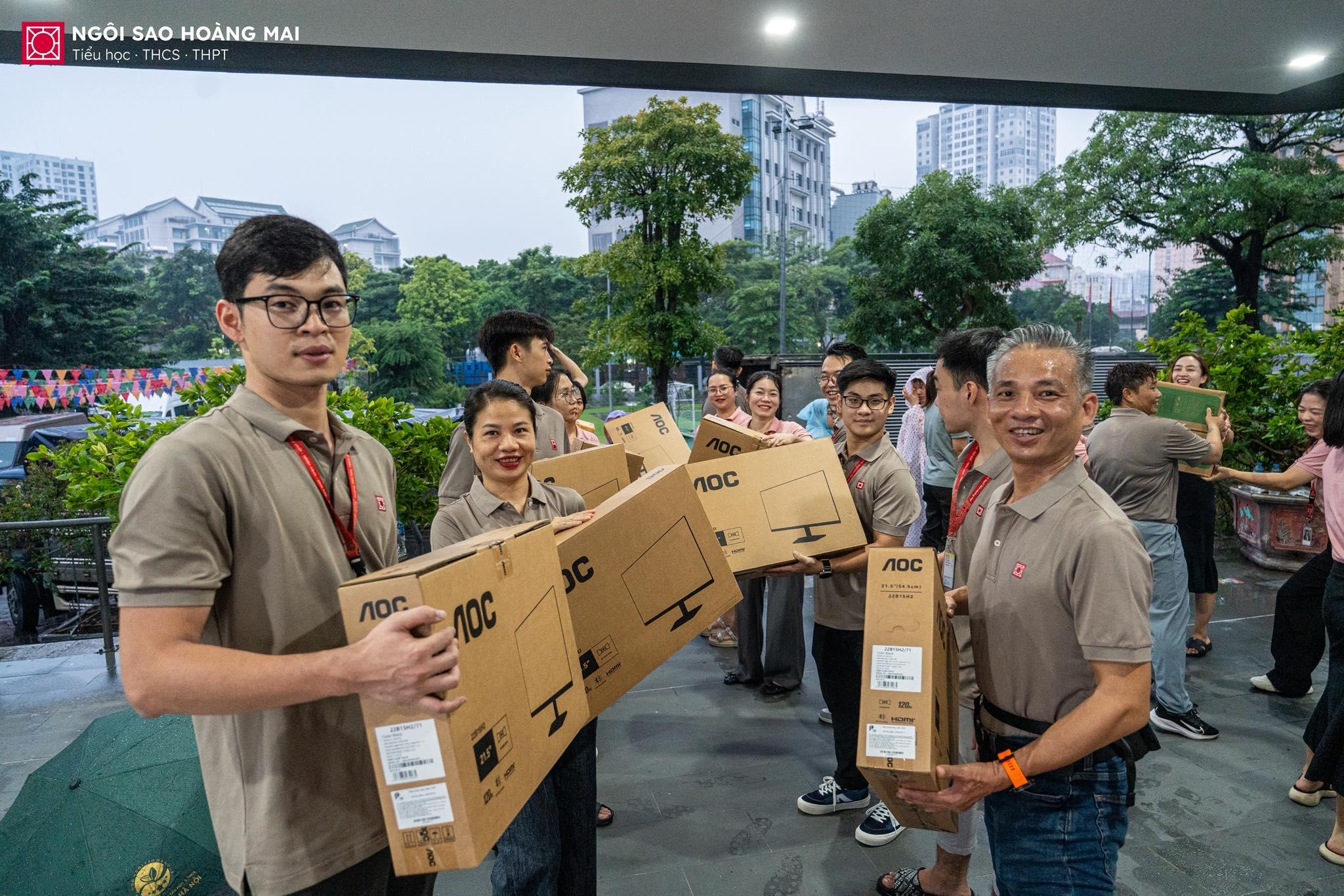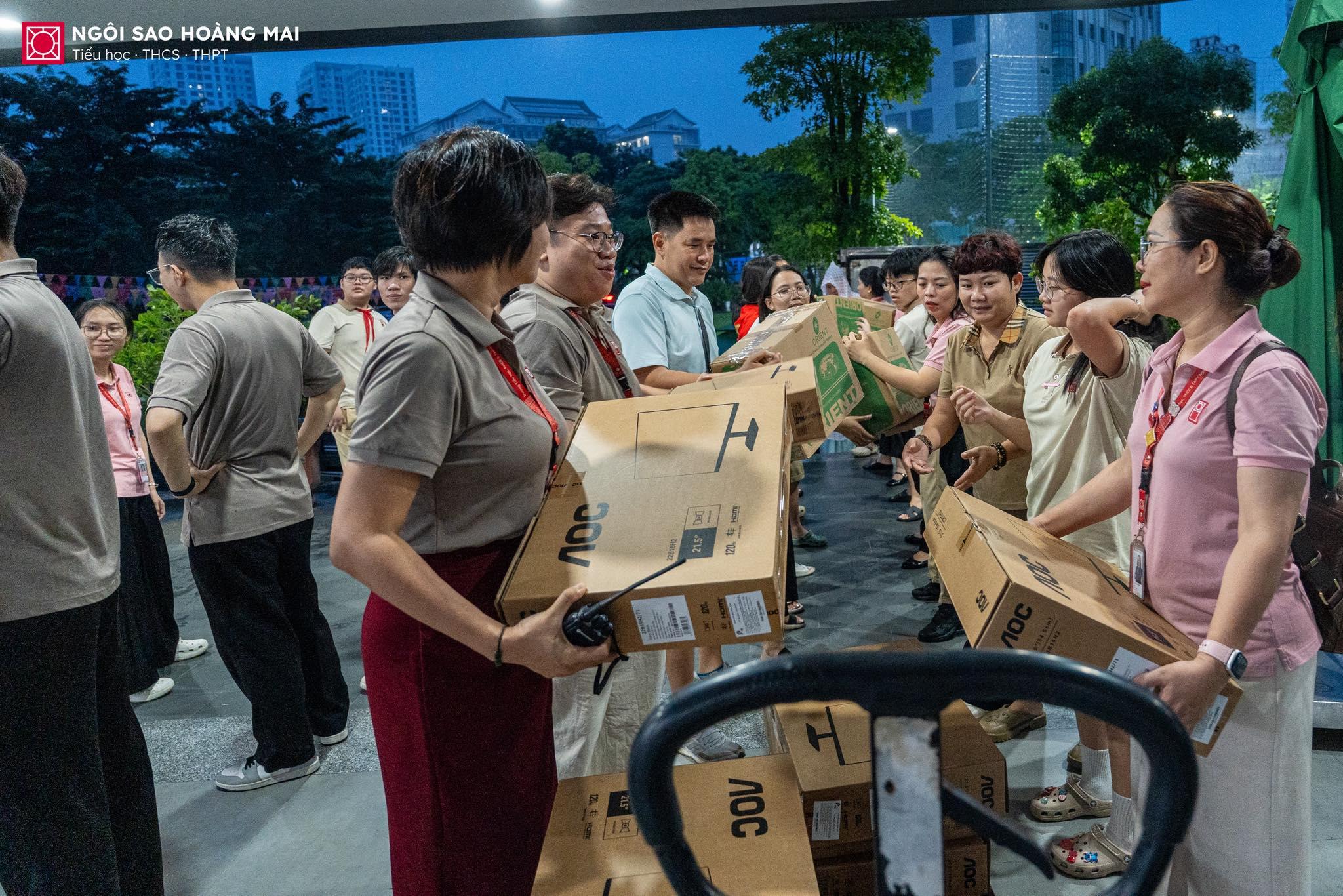 🌧️ Từ sáng sớm trên sân trường Ngôi Sao Hoàng Mai, dù mưa rơi nặng hạt, nhưng chẳng ai ngại ướt áo. Thầy cô, cha mẹ và các con học sinh vẫn cùng nhau bốc xếp từng thùng quà, mỗi món quà là một tấm lòng, một lời nhắn gửi yêu thương hướng về thầy trò vùng lũ. Giữa tiết trời mưa gió, không khí trên sân trường lại trở nên thật ấm áp bởi hơi ấm của tình người, của những trái tim cùng chung nhịp đập sẻ chia.